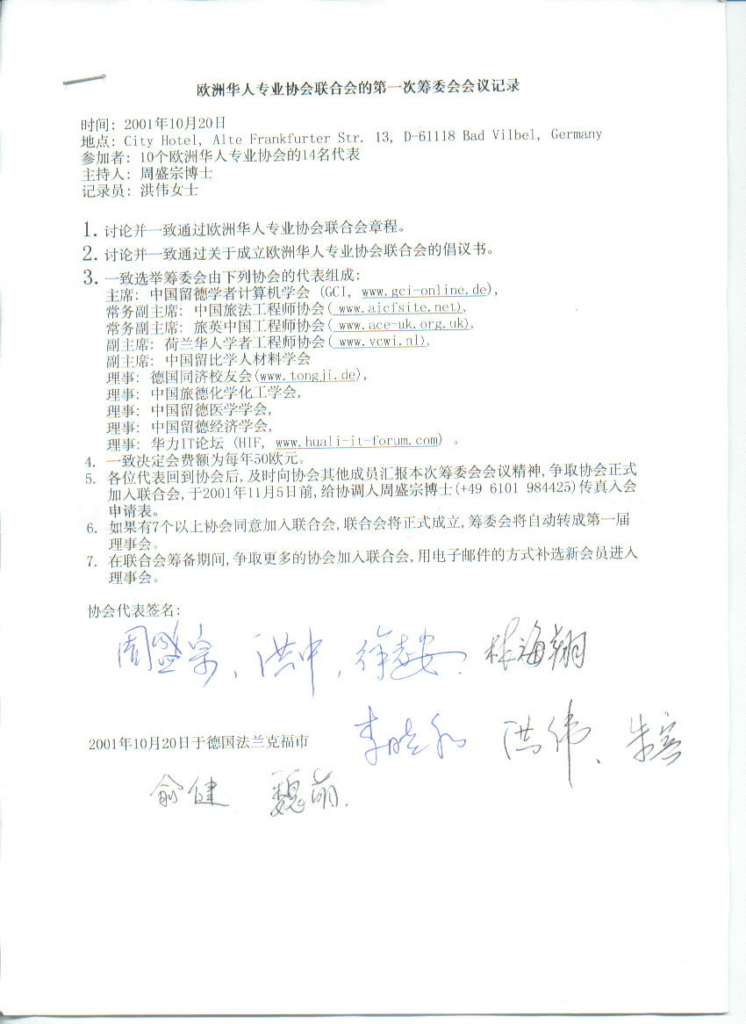 2001年10月20至21日中国留德学者计算机学会2001年年会暨华力IT论坛第25次研讨会在德国巴特维尔贝尔市成功举行。十个协会的十四名代表开会,一致决定成立全欧华人专业协会联合会筹委会。2001年11月21日10个华人专业协会同意加入全欧华人专业协会联合会。根据10月20日在德国巴特维尔贝尔市达成的协议,全欧华人专业协会联合会正式在德国法兰克福成立。中国留德学者计算机学会为2002年度主席协会,其主席周盛宗博士为2002年度联合会主席。根据章程,周盛宗博士提名中国留德学者计算机学会常务副主席朱宾博士为联合会秘书长。中国留德学者计算机学会、华力IT论坛、中国留德学者经济学会、德国同济校友会、荷兰华人学者工程师协会、比利时华人材料学会、留瑞学者通讯与计算机学会、中国旅英工程师协会、中国旅法工程师协会、中国旅德学者化学化工学会等10个协会为创始会员。周盛宗博士、魏家球博士、洪中博士、余安东教授、林海翔博士、赵超博士、刘耀进博士、周克明博士、钱敏先生为创始理事。张敏博士为常务副秘书长,张展先生、李晓和先生、于芳女士、梁薇女士为副秘书长。