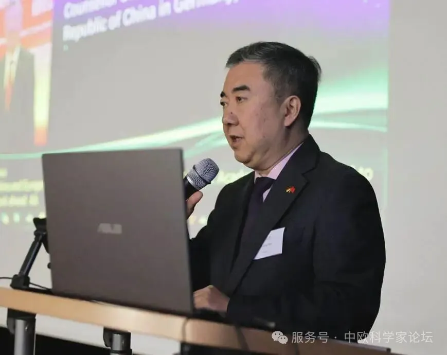 中国驻德国大使馆教育处周志强参赞在致辞中强调,科技交流始终是维系中欧关系的重要桥梁,双方在人工智能、生物医药、气候变化等领域合作潜力巨大。面对全球性挑战,中欧科学家应深化合作,以科技进步助力人类社会可持续发展。