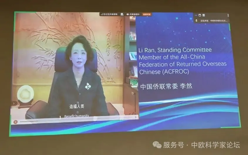 中国侨联常委、香港北京高校校友联盟会长李然在视频致辞中表示,论坛为中欧搭建了开放高效的科技合作桥梁,推动了基础研究与前沿技术务实对接。她介绍,今年中欧科学家论坛已成功举办多场学术活动,并助力第二届香港世界青年科学大会的成功举办。期待以本届论坛为新起点,汇聚中欧创新力量,服务人类共同福祉。全欧华人专业协会联合会主席周捷致辞中说科学是人类共同的语言,合作是时代最强的呼声。FCPAE及遍布欧洲的数万名会员,始终是中欧科技合作的坚定支持者和积极参与者。希望论坛成为连接中欧科研头脑的 “连接器”、加速知识技术转化的 “加速器” 和孵化青年才俊构想的 “孵化器”。愿与各方一道,共同搭建更多元、更畅通、更高效的交流渠道。